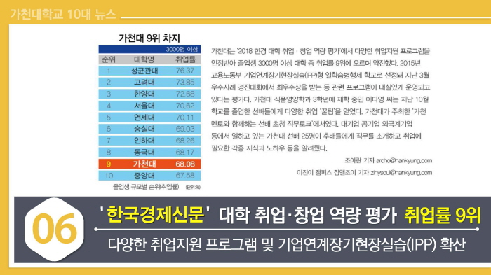 가천대, '한국경제 대학 취업·창업 역량 평가' 취업률 9위 관련 언론 기사입니다.