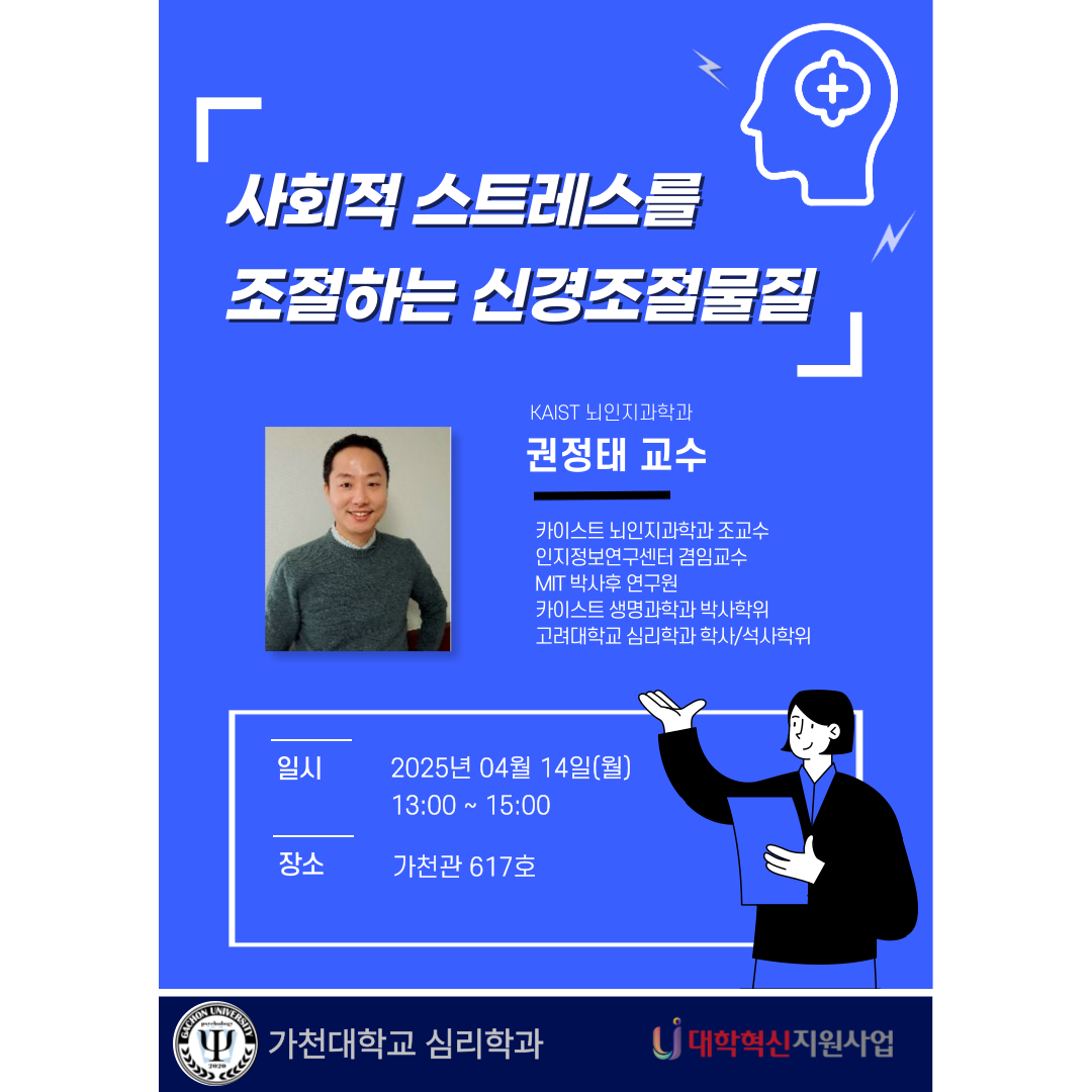 지난 4월 14일, “사회적 스트레스를 코딩하는 신경조절물질”이라는 주제로 KAIST 뇌인지과학과 권정태 교수님께서 학과세미나 특강을 진행해 주셨습니다. 동물모델을 통해 사회적 충동과 스트레스를 일으키는 편도체 회로와 신경조절물질에 대해 강의를 해주셨고, 이로 인해 발생하는 수면장애 원리까지 접해볼 수 있는 좋은 기회가 되었습니다.