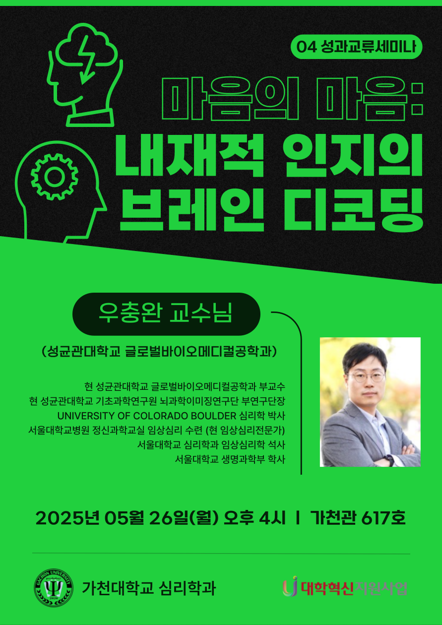 마지막으로 지난 5월 26일, 성균관대학교 글로벌바이오메디컬공학과 우충완 교수님께서 “마음의 마음 : 내재적 인지의 브레인 디코딩”이라는 주제로 특강을 진행해 주셨습니다. 해당 특강을 통해, 내재적 인지 연구의 중요성에 대해 알아보고, 여러 과학 기법을 이용한 정서적 문제를 예측하고 분석할 수 있는 방법을 소개해 주었습니다. 심리학과생들이 브레인 디코딩 연구와 휴지기 뉴로이미징 데이터와 같은 새로운 연구 방법을 접해볼 수 있는 기회가 되었습니다.