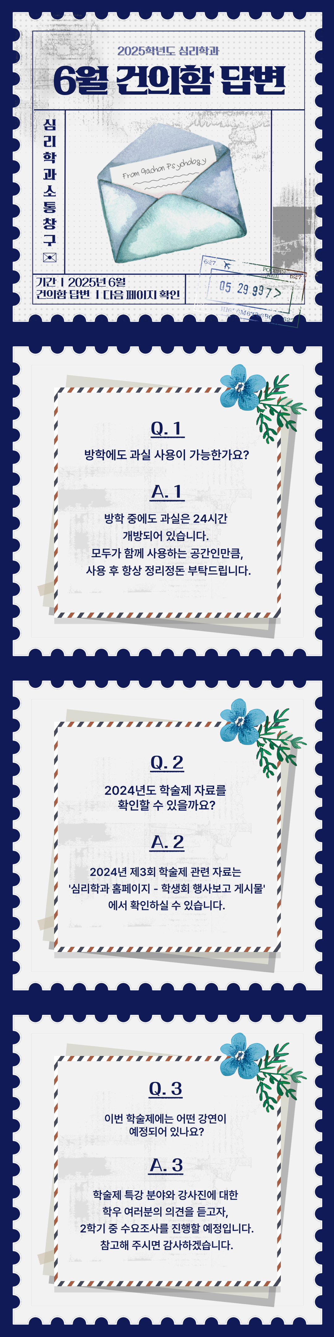 학우분들과의 더 원활한 소통을 위해 개설한 2025 심리학과 건의함 6월 답변입니다.