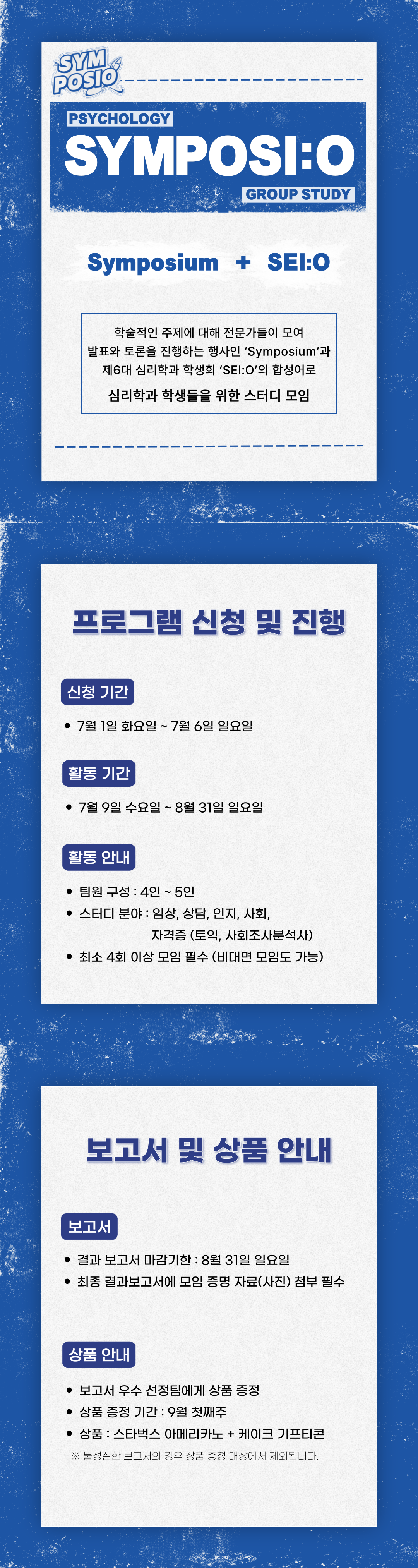 즐거운 방학 보내시고 계신가요? 방학기간을 활용해 심리학과만의 학습공동체, 'SYMPOSI:O'를 진행하려합니다. 6가지 분야 중 원하는 분야를 선택하여 구글폼을 제출해주시면 저희 SEI:O가 조를 구성할 예정이며, 조별 톡방에 초대 후 자유롭게 스터디를 진행해 주시면 됩니다. 많은 참여와 관심 부탁드립니다 !