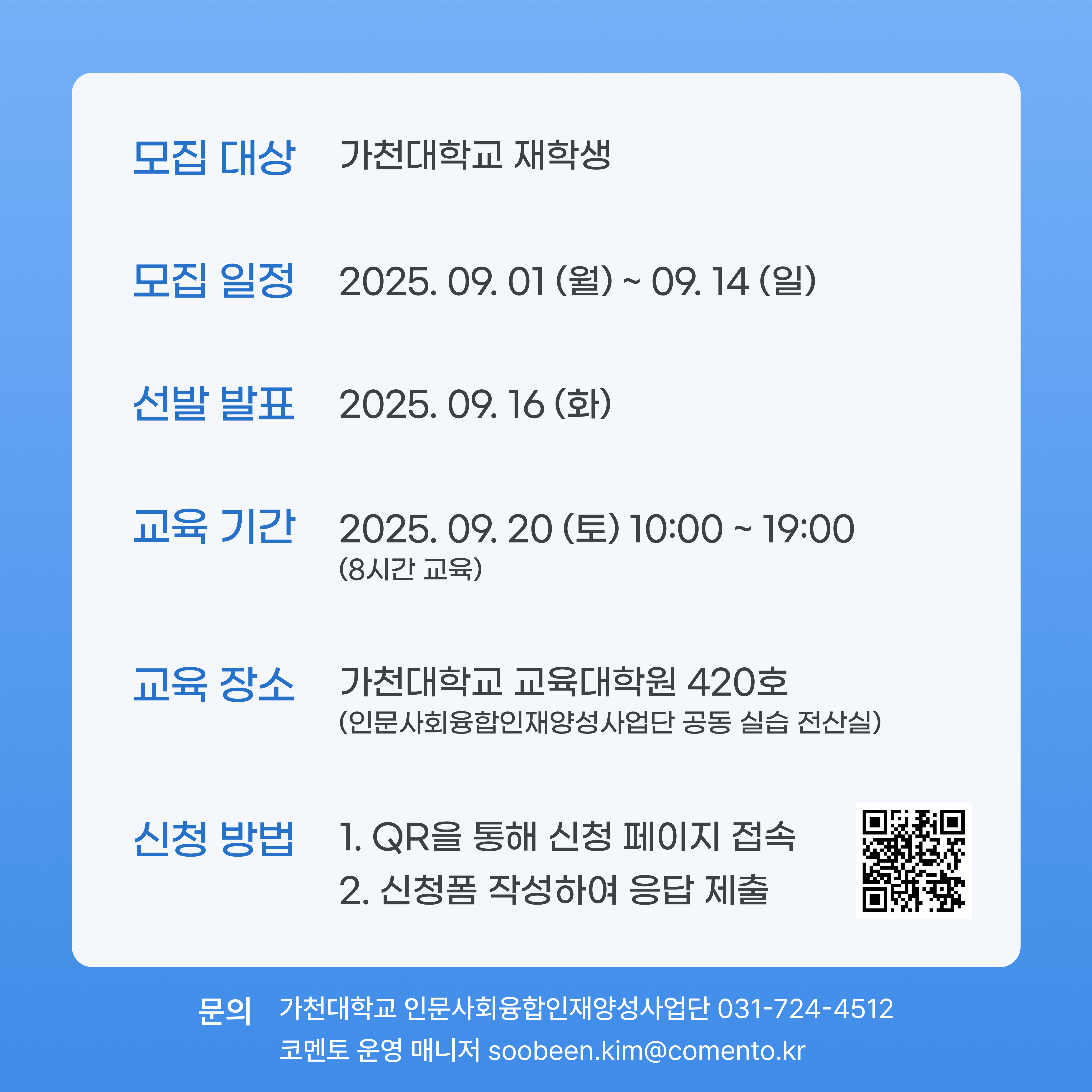fnctId=bbs,fnctNo=1200 글번호 112718 [인문사회융합인재양성사업단] 인구구조 전문가 양성을 위한 생성형 AI 교육 프로그램 학생 안내 및 홍보 수정일 2025.09.02 작성자 스마트시티학과 조회수 71 등록일 2025.09.02