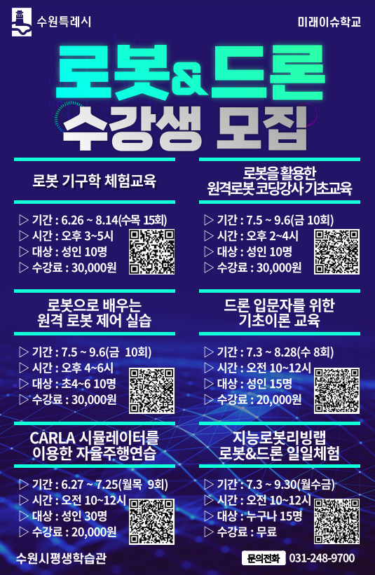 fnctId=bbs,fnctNo=1200 글번호 98698 수원시평생학습관 로봇·드론 및 자율주행 프로그램 수강생모집 수정일 2024.06.24 작성자 202413034 조회수 283 등록일 2024.06.24