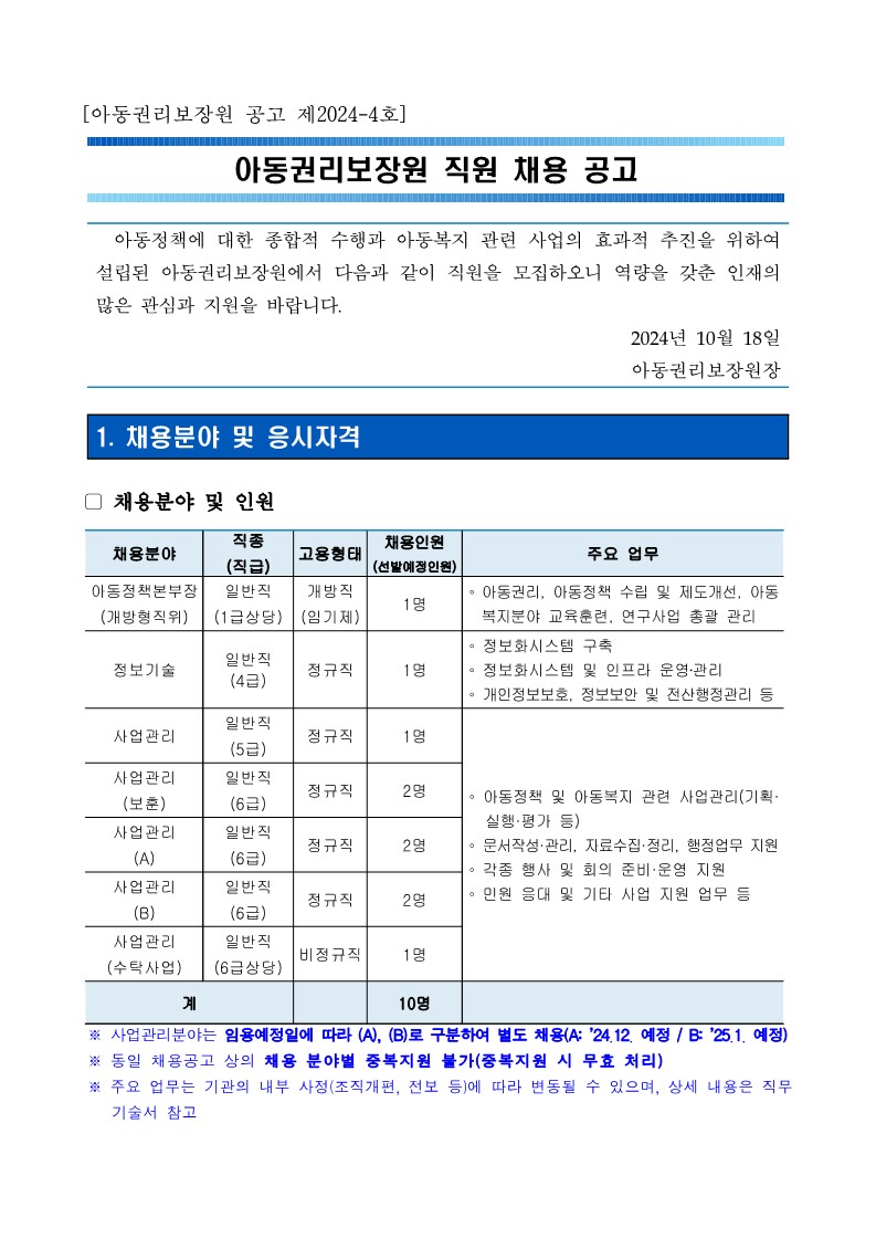 [채용] 아동권리보장원 직원 채용 공고 안내