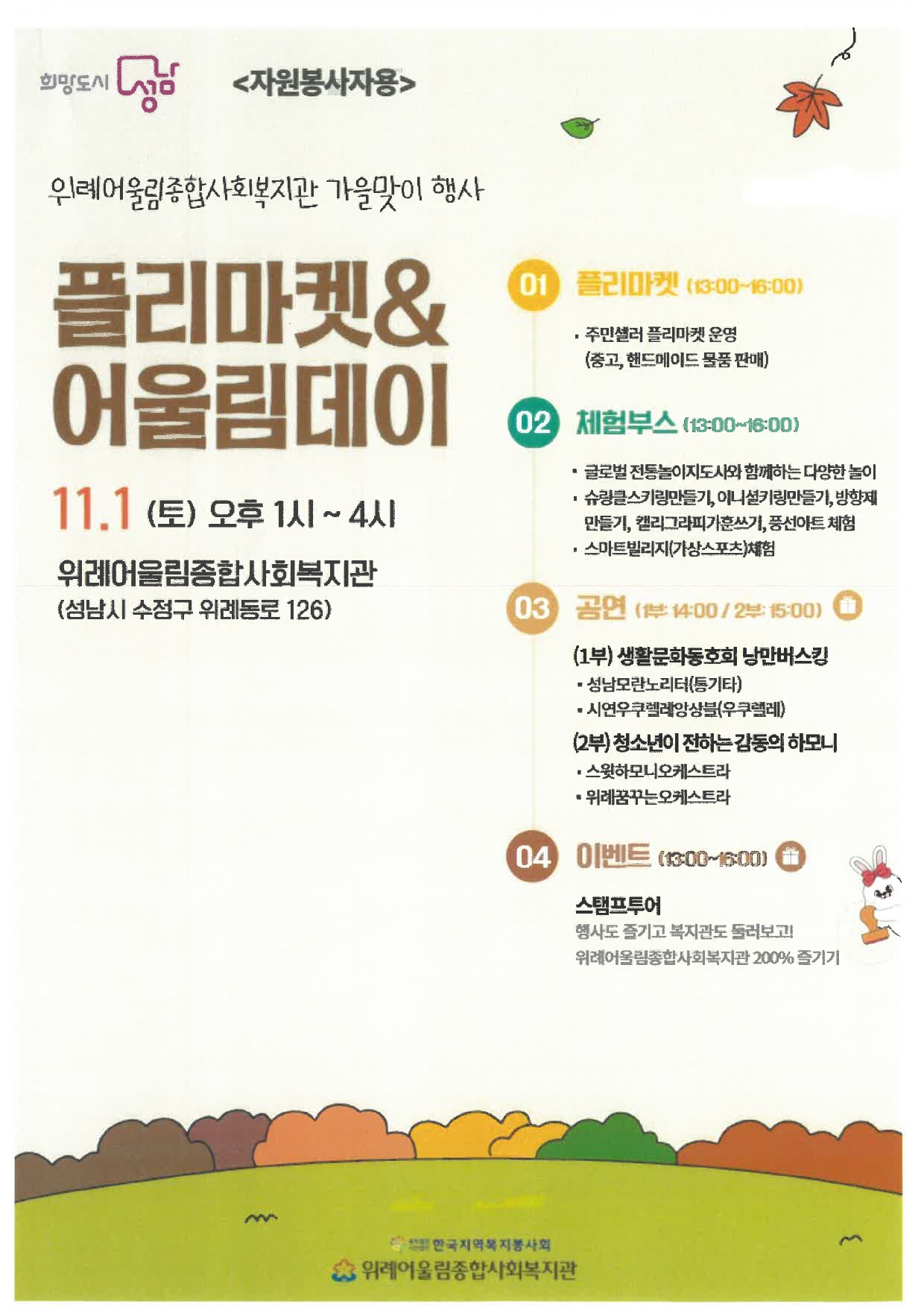 [봉사] 위례어울림종합사회복지관 가을맞이 자원봉사자 모집 안내