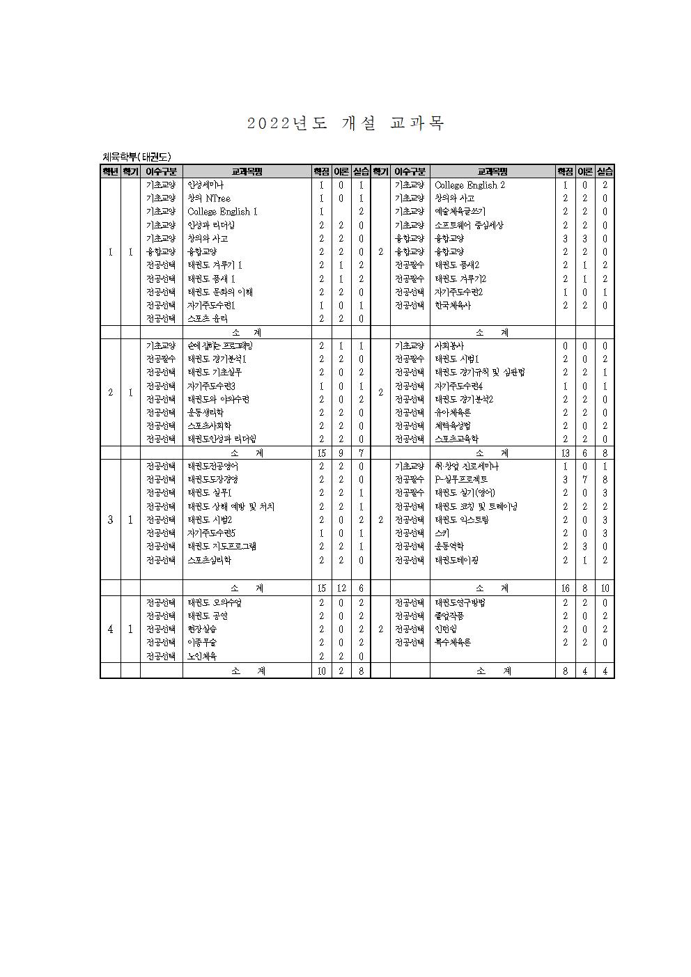 (*태권도연구방법론 교과목은 2022-2학기에 개설될 예정이오니, 전필과목에 해당되는 학번들은 복학 시, 이 점 유념하시길 바랍니다.)