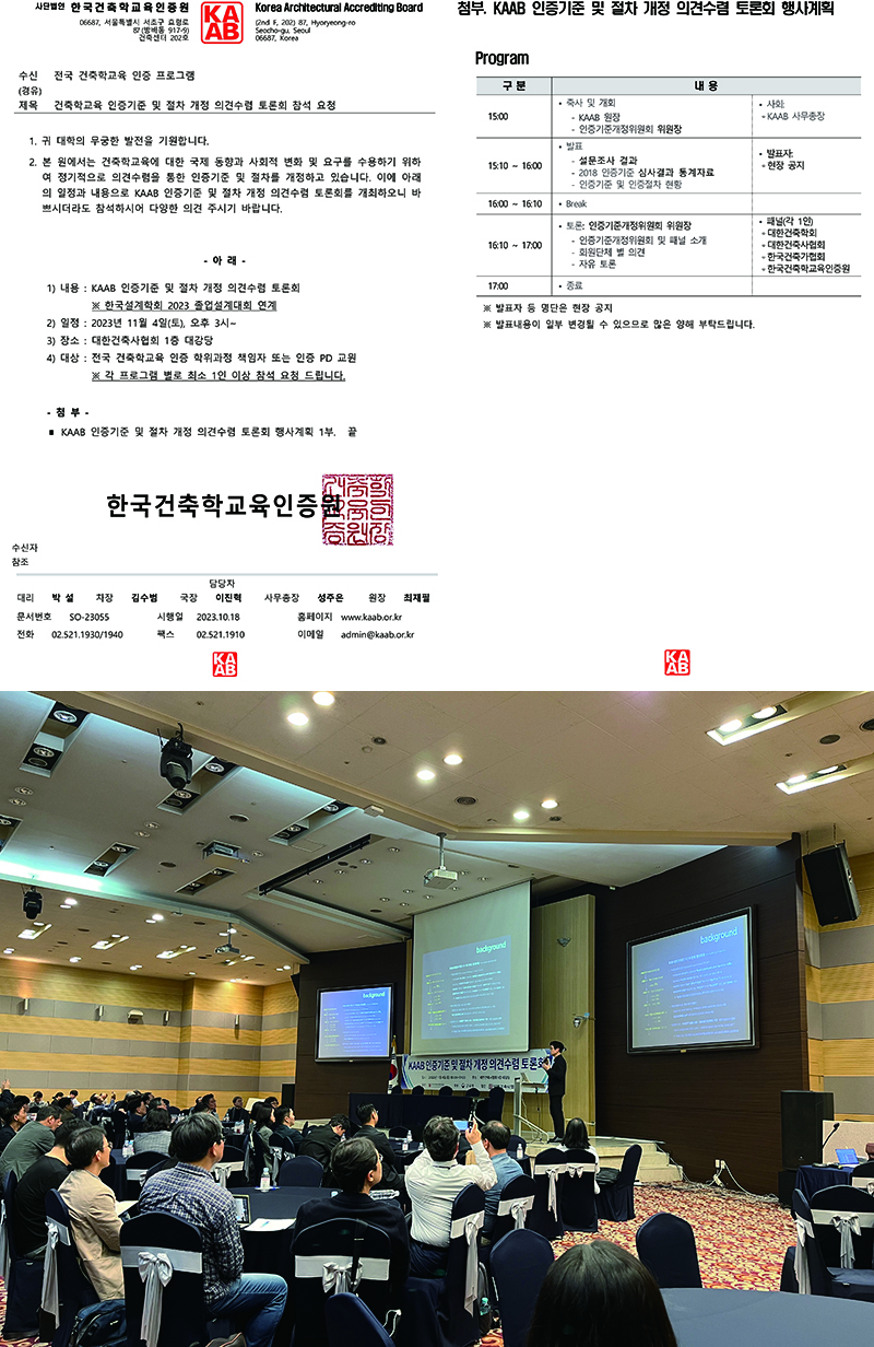 가천대 건축학전공은 한국건축학교육인증원의 초청으로 2023년 11월 4일 대한건축사협회에서 개최된 향후 건축학교육 인증과 관련한 의견 수렴 및 토론회에 참석하였습니다.