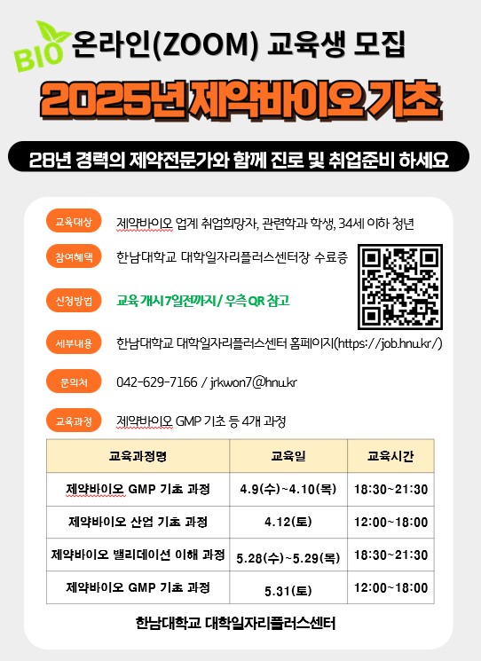 청년 고용촉진 및 취업역량강화를 위한 「2025학년도 제약바이오 기초 교육과정」 프로그램을 마련하였습니다.