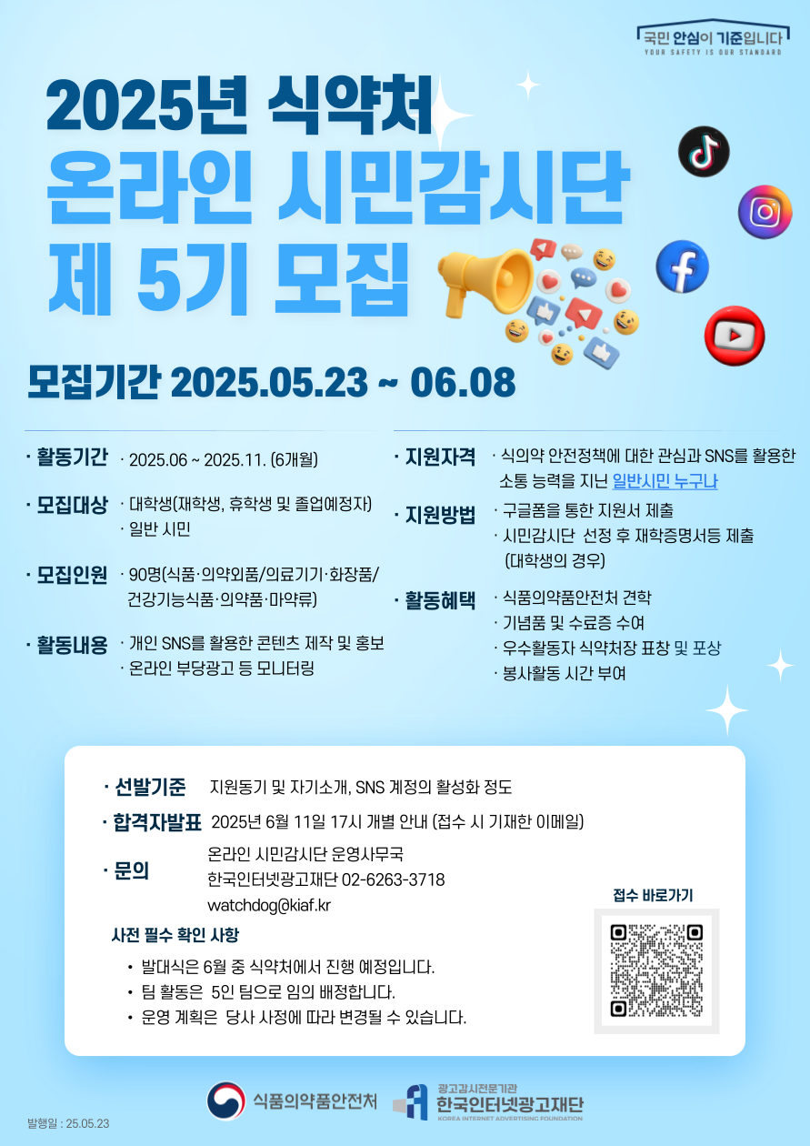 2025 식품의약품안전처 대학생 온라인 시민감시단 제5기 모집이 시작되었습니다.